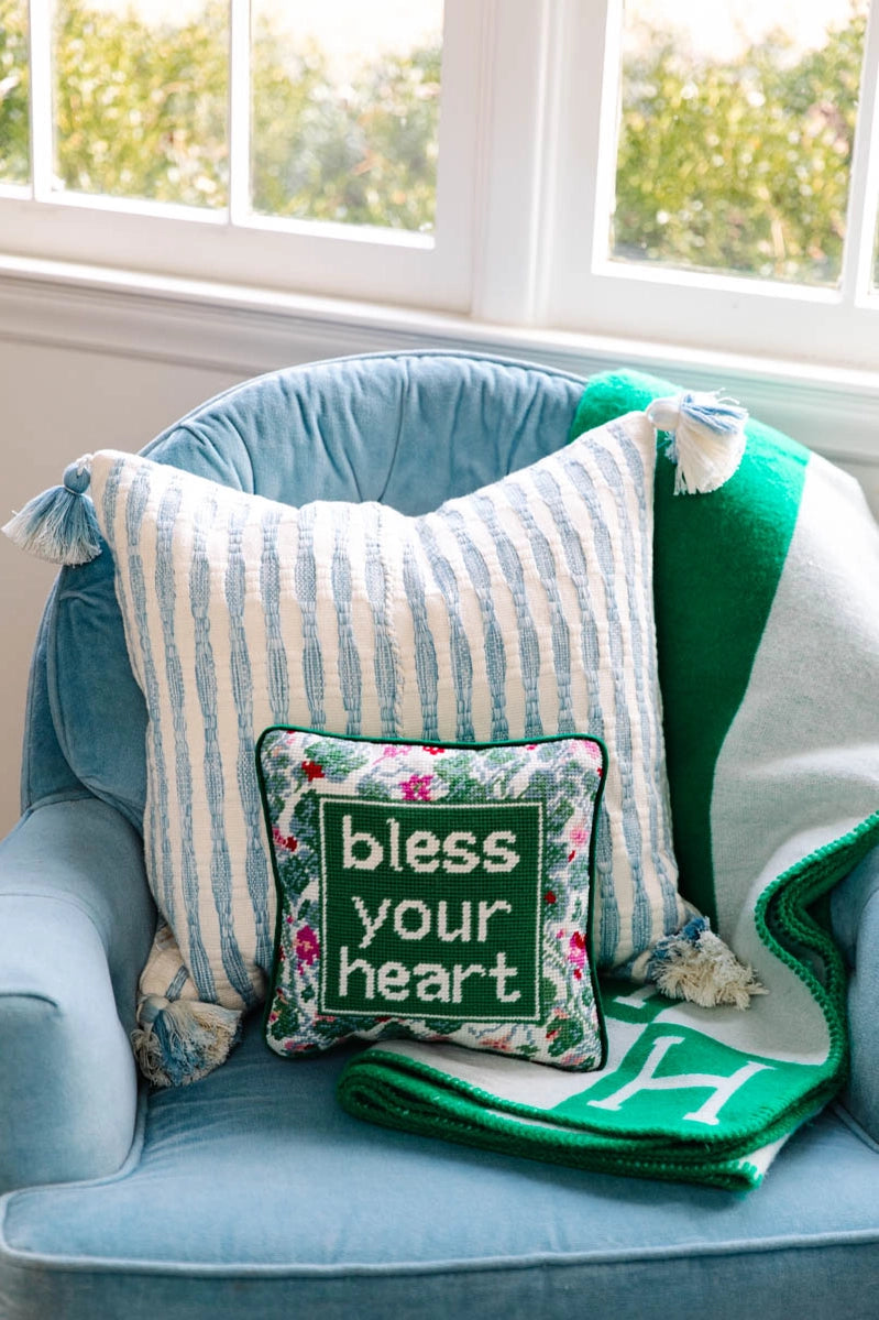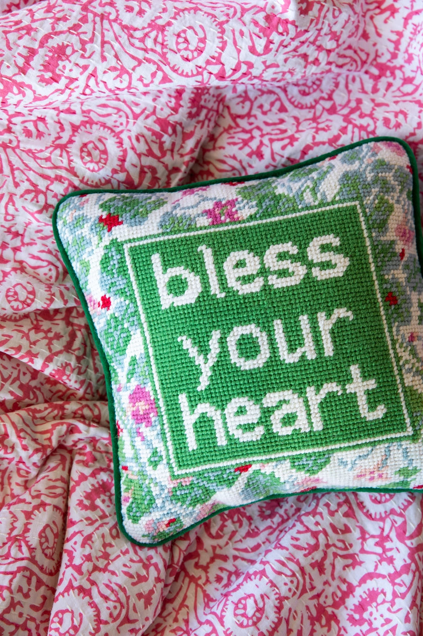 Make a statement with this charming-meets-chic needlepoint pillow. Embroidered and backed in luxe green velvet, we've revived this Southern staple with sayings that are sure to get a smile. They are guaranteed to spark joy and make the perfect gift!
