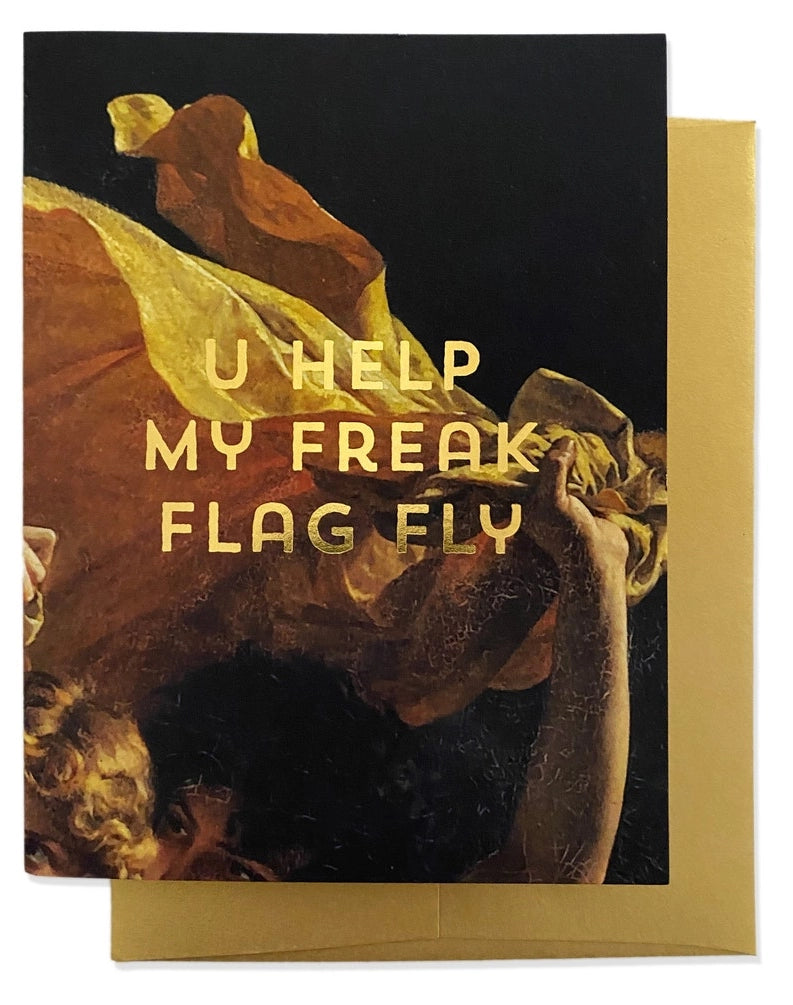 "U HELP MY FREAK FLAG FLY" is stamped in gold foil over lush detail of an old master's painting (adorning the entire card front and back).