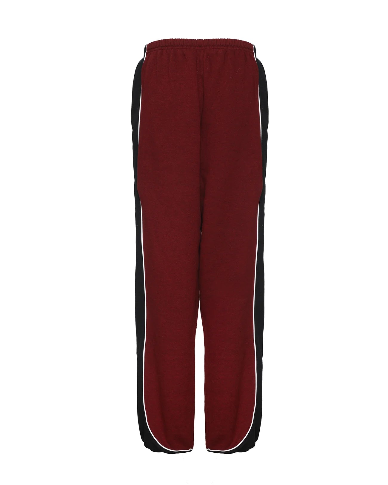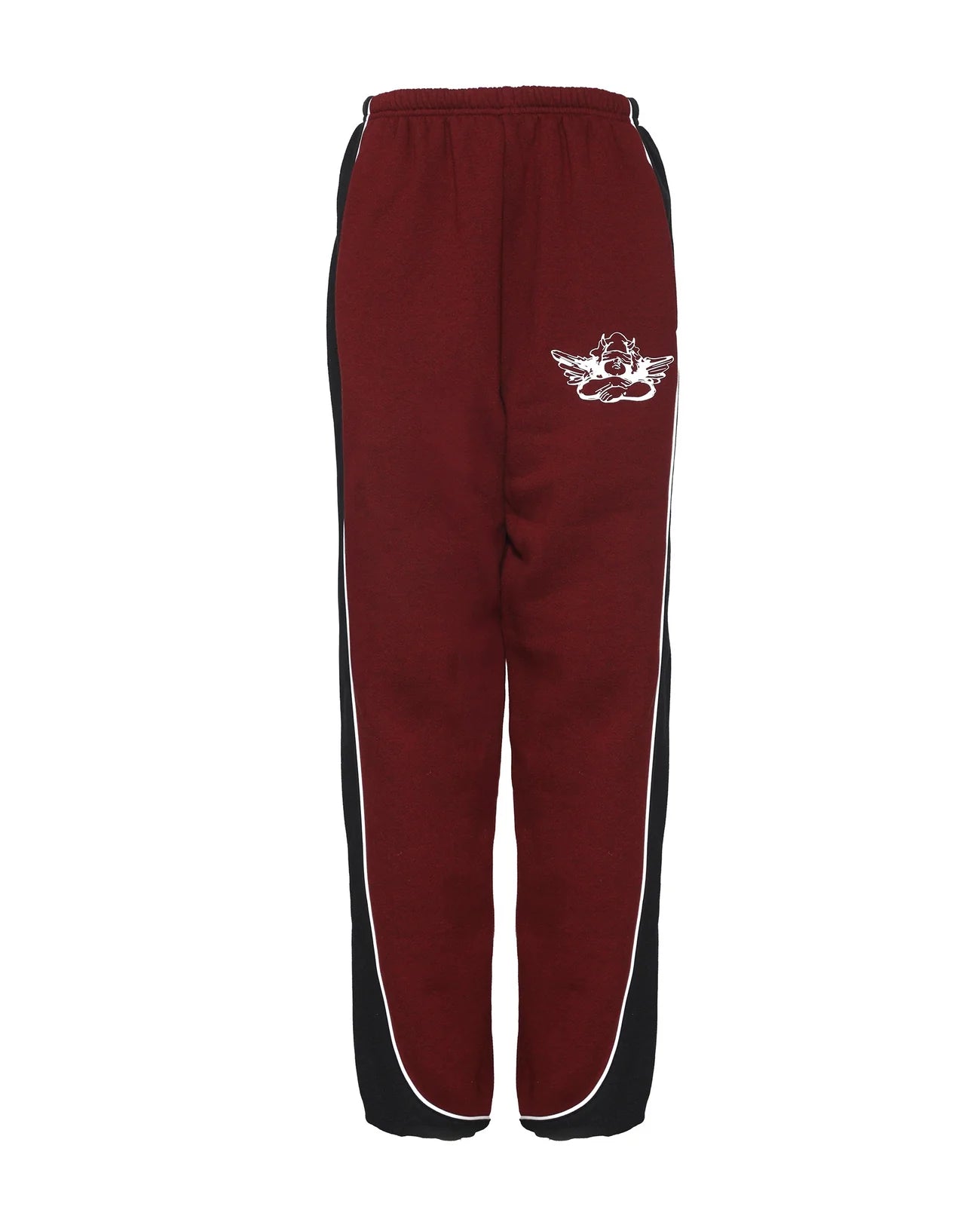 These burgundy sweatpants feature black side paneling with white piping for a sporty, contrast look. Finished with a white cherub graphic on the front, they combine a relaxed fit with a clean, elevated feel.