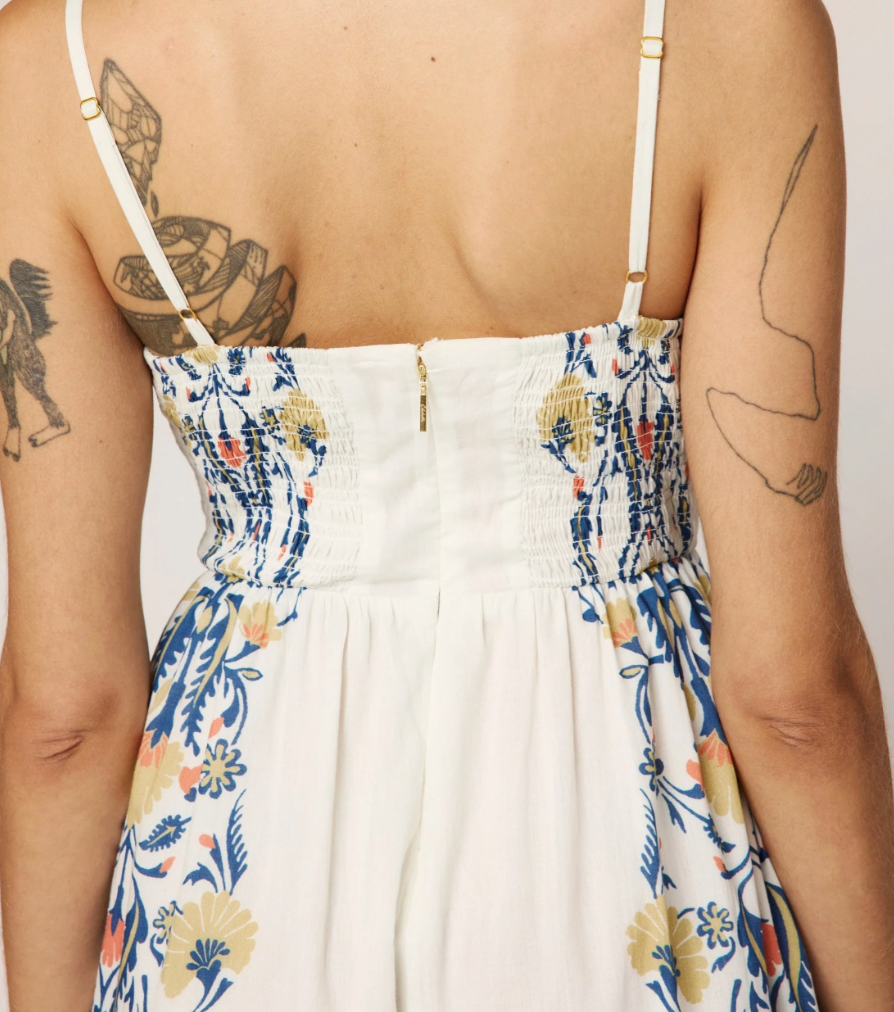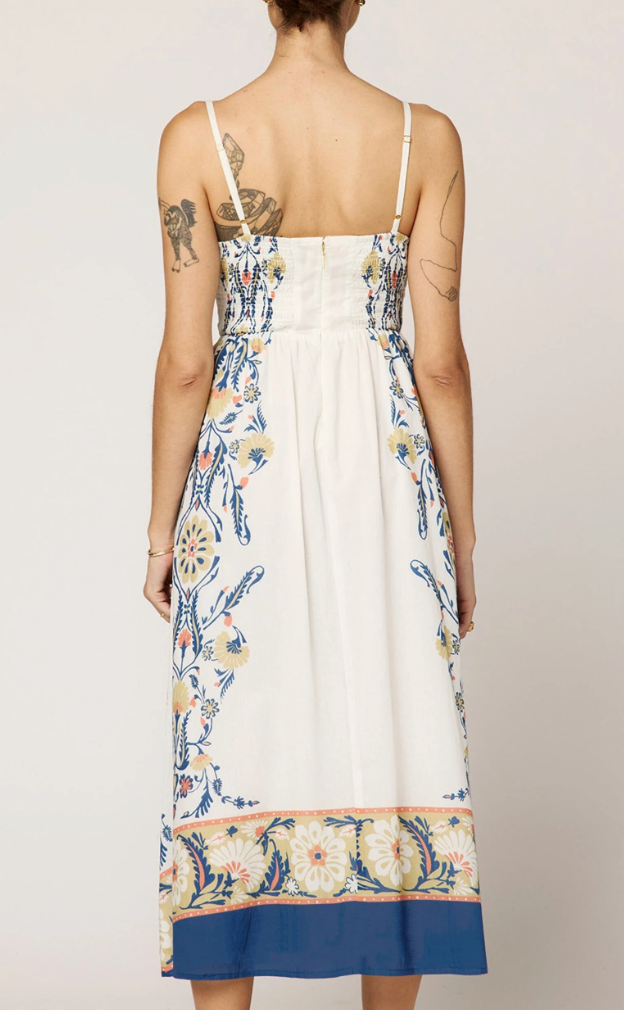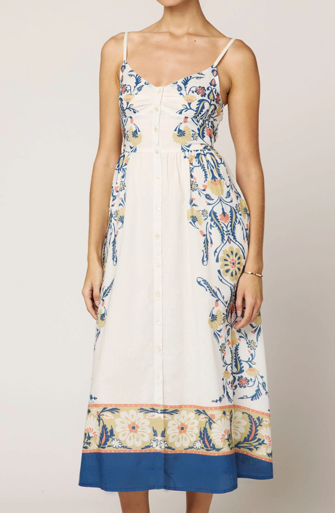 The Tamasin Midi Dress features a sweetheart neckline, button-front detail, and side smocking for a flattering fit. Finished with a bold border print and adjustable straps, it’s perfect for sunny days or warm evenings.