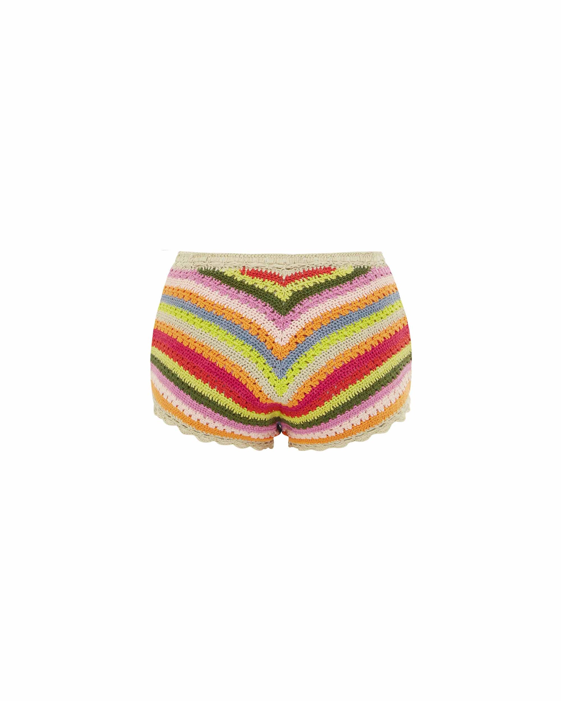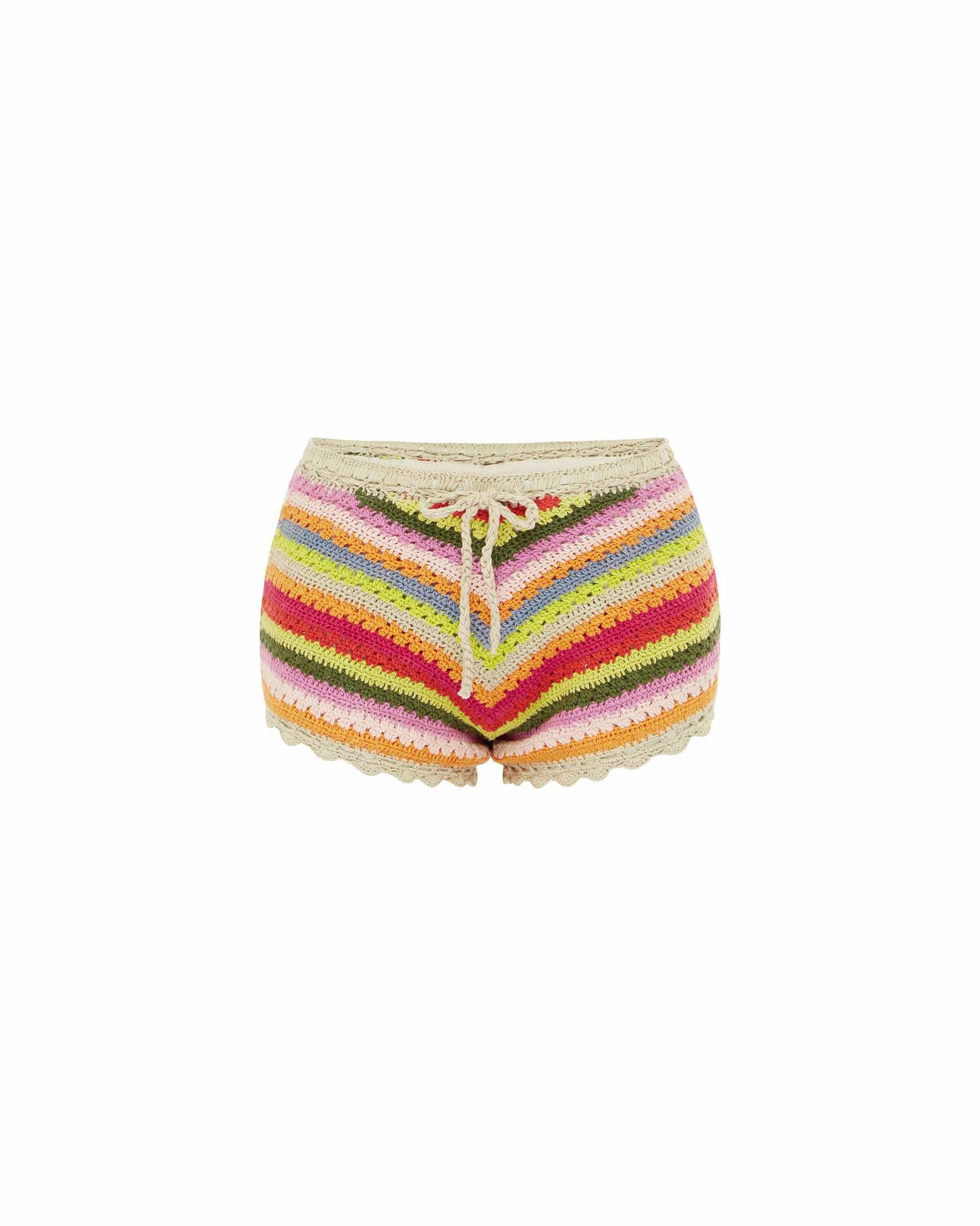 The Crochet Shortie in Howdy is crafted vibrant hand-crochet summer stripes. Doubling as beach shorts, they effortlessly pair with your favorite t-shirt for an laid-back look.