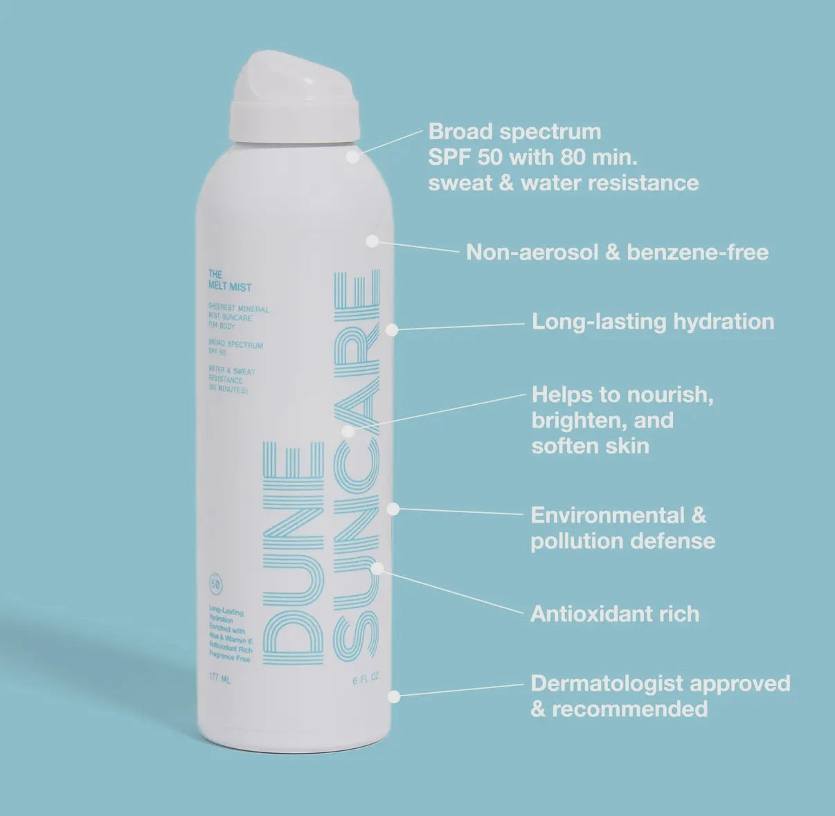 Ultra hydrating and nourishing sheer mineral SPF, with good-for-you skincare benefits, in a refreshing, non-aerosol mist that melts into every bod, every day.