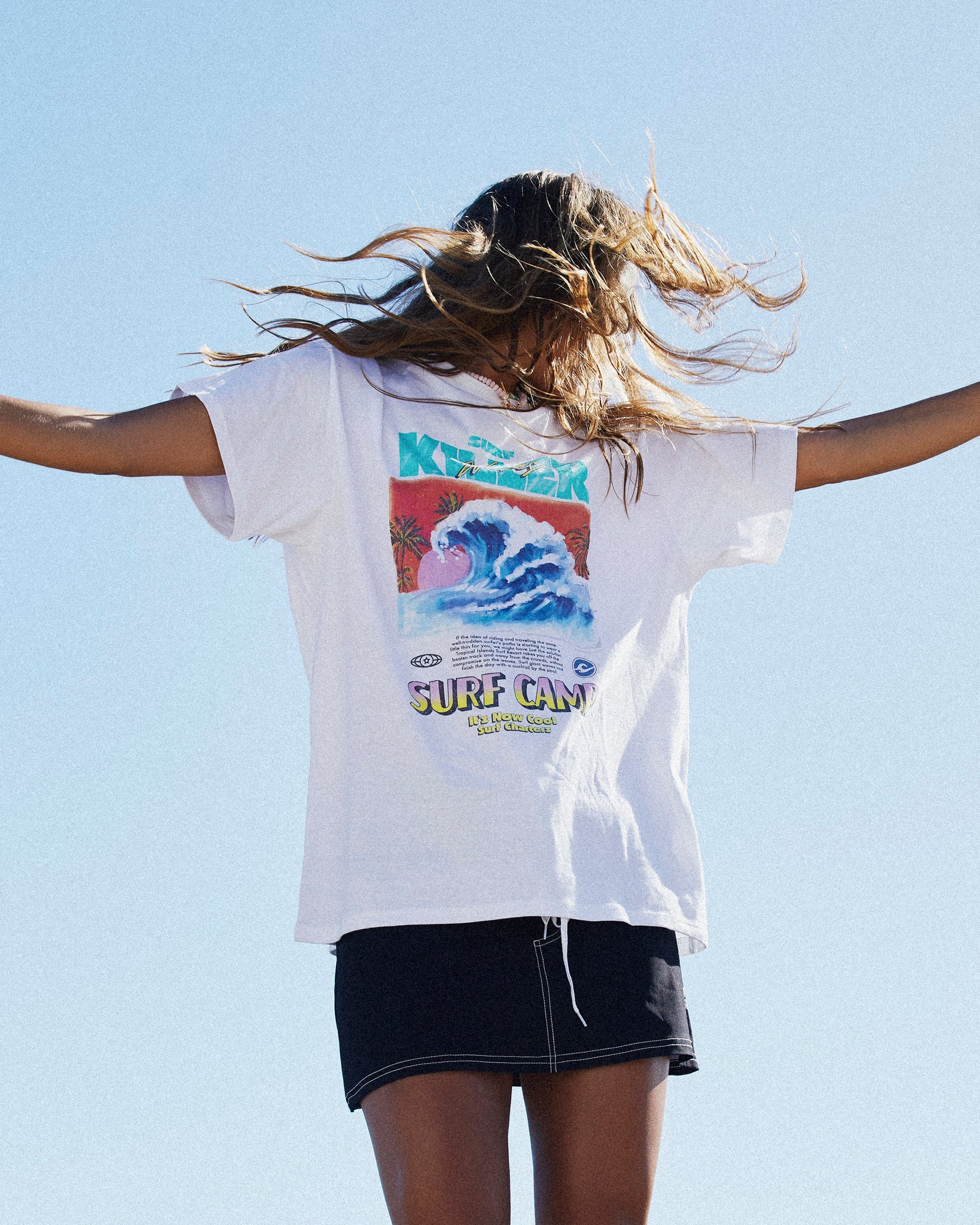 The Signature Tee in Surf Camp pays homage to 90s surf culture and vintage surf tees, featuring out stand out ocean graphic.