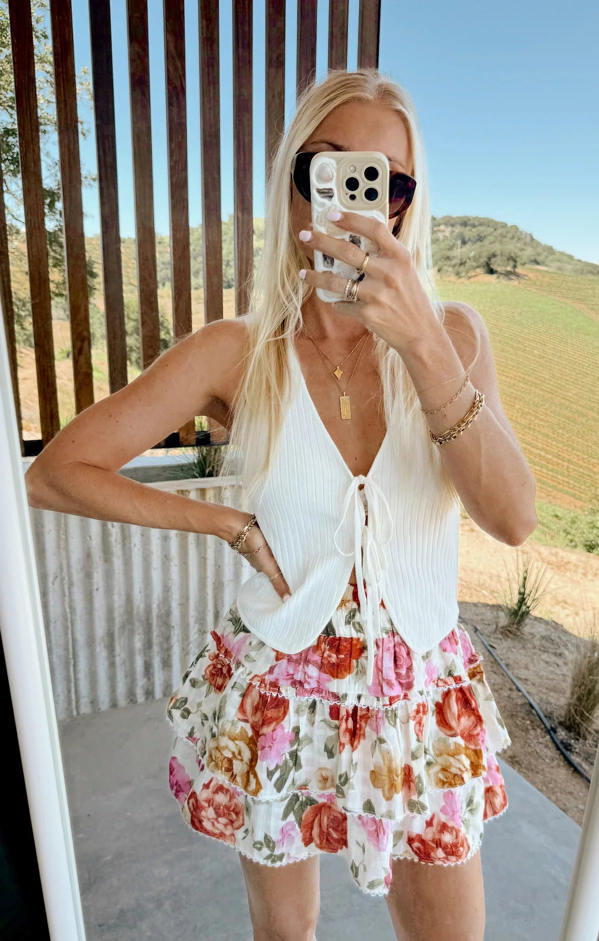 Time Out! Our new Tie Top will be your favorite summer tank. White ribbed knit shapes your figure, while front ties provide a custom look. Style with jean shorts and cowboy boots for a flirty festival 'fit.